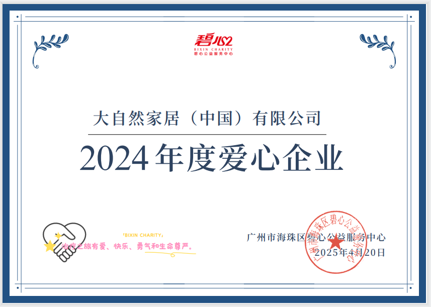 大自然家居堅持“擔環保責任、普健康生活、做健康家居”的企業使命。2006年,大自然推出“中國綠色版圖工程”,至今每年堅持公益植樹,向中國綠化基金會累計捐資2000萬元,先后在國內外組織“我為黃河種棵樹”、“我為呼吸種棵樹”、“我為孩子種棵樹”、“我為藍天種棵樹”等公益植樹活動,在國內外22個地區已種植30片生態林,植樹超100萬棵。